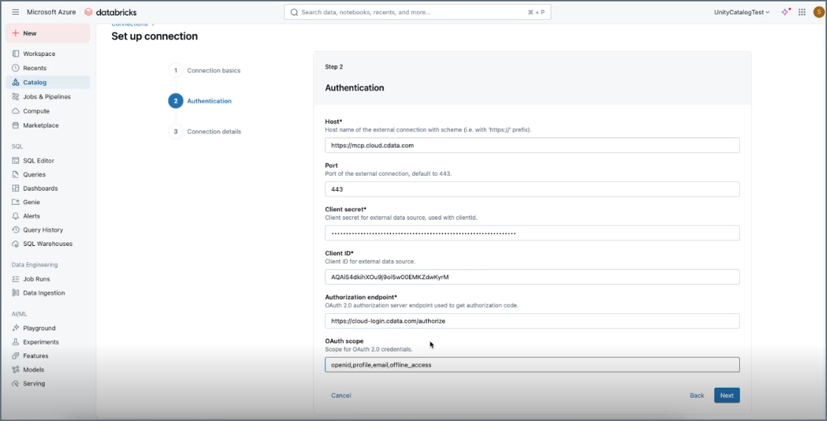 Contact CData Support to obtain a Client Id and Client Secret to enter in Databricks MCP Marketplace. You must provide support with your callback URL specific to your Databricks MCP Marketplace instance. This is found in the beginning of the Databricks MCP Marketplace URL.