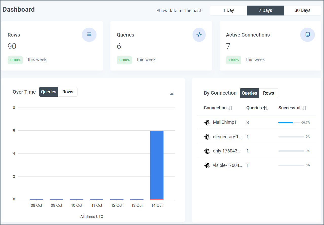 - Queries: The total number of queries, both successful and failed, that are made by the connection in the selected time period