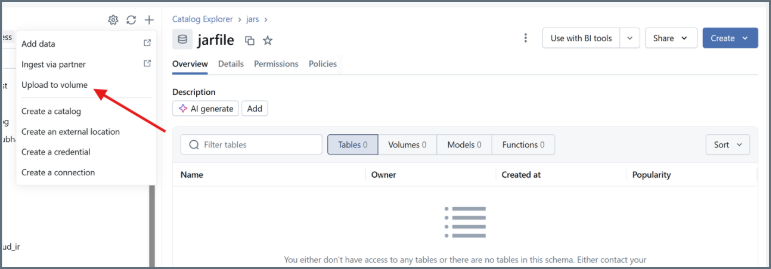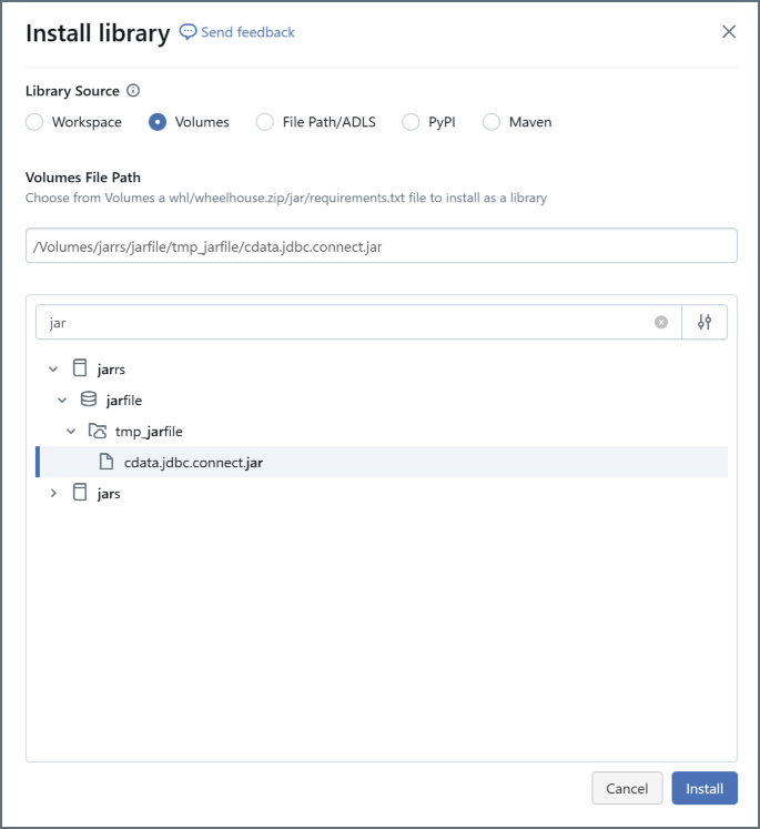 Install the new library. For Library Source, select Volumes. Select the JAR file and click Install.